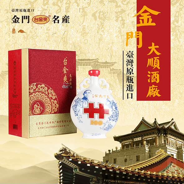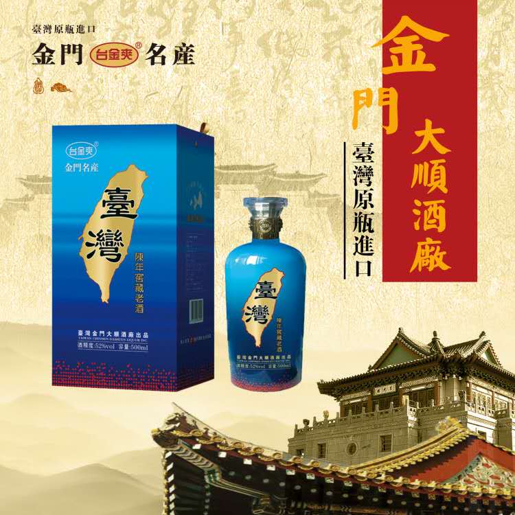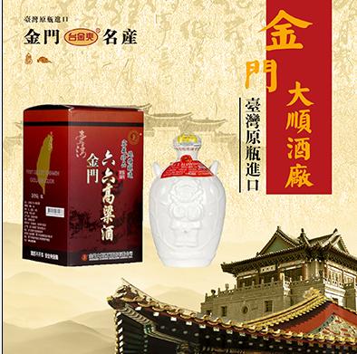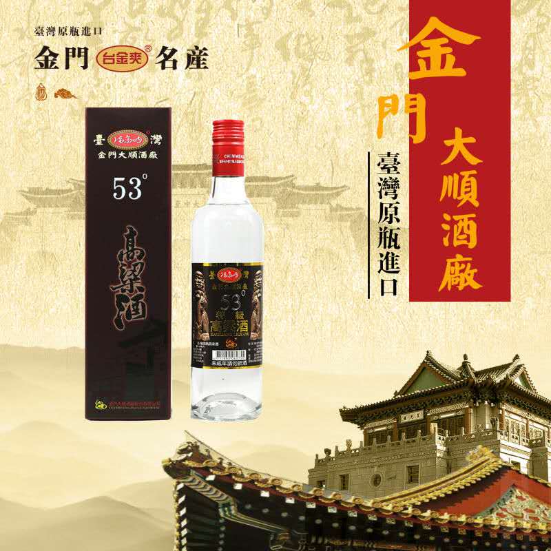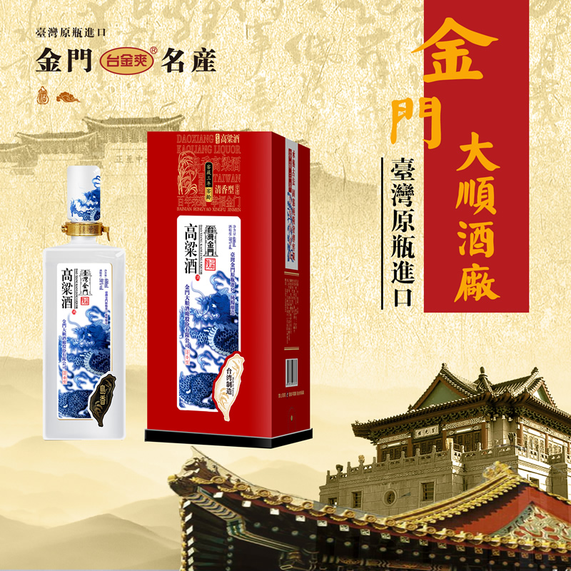 金門大順酒廠,座落于金門北緯24.5度,地處海隅,濱大陸,得天獨厚的地理,使它擁有絕佳的水質(zhì)、空氣、氣候及原料的四大天然釀酒條件。金門大順酒廠的高粱酒釀造是利用金門特產(chǎn)『旱地高粱』、引用當?shù)厮|(zhì)甘甜的泉水、金門潔凈的空氣與氣候條件,并承襲傳統(tǒng)古法之釀酒技術(shù),加上獨家的釀酒專業(yè)技術(shù)經(jīng)驗【三離二鍋一翻】的發(fā)酵釀酒工藝,經(jīng)掐頭去尾后入庫,去蕪存菁。而造就出金門大順酒廠的高粱酒特色「清澈透明、質(zhì)地純凈、芳香濃郁」之一系列高粱酒。金門大順酒廠制酒承襲著金門得天獨厚的地理環(huán)境,加上三代流傳之古法醇釀技技術(shù),結(jié)合經(jīng)驗與現(xiàn)代化生產(chǎn),釀出風(fēng)味獨特,香、醇、甘、冽的【臺島】【臺金爽】【牛樟芝高粱酒】【龍騰鳳舞】【紅雙十】【陳高吶】【臺灣小酒】等多樣系列產(chǎn)品。真實原味、清香散發(fā),甘冽醇厚的絕佳風(fēng)味。